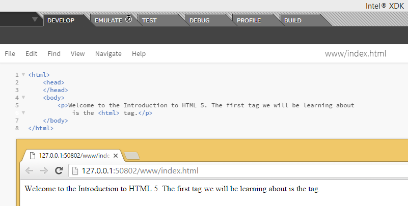 - <p>Welcome to the Introduction to HTML 5. The first tag we will be learning about is the <html> tag.</p>